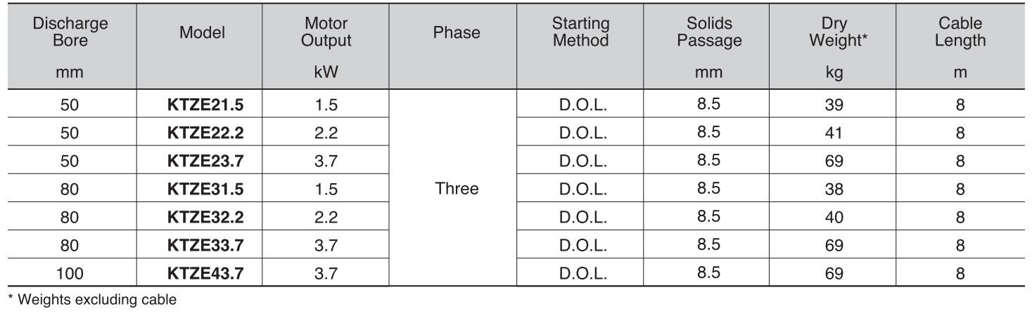 TSURUMI รุ่น KTZE-series ทำงานอัตโนมัติด้วยอิเล็กโทรด เป็นปั๊มจุ่มระบายน้ำสำหรับงานหนักชนิดเฮดสูงแบบอัตโนมัติสามเฟสที่ทำจากเหล็กหล่อ ชุดรีเลย์ชนิดอิเล็กโทรดที่เป็นนวัตกรรมซึ่งสร้างขึ้นในตัวปั๊ม จะทำการเริ่มและหยุดปั๊มโดยอัตโนมัติเพื่อขจัดปัญหาการทำงานโดยไม่มีน้ำ (dry-running) กลไกนี้ช่วยลดการใช้พลังงานได้อย่างมากและยืดอายุการใช้งาน ตัวเครื่องที่ทำจากเหล็กหล่อพร้อมใบพัดเหล็กหล่อโครเมียมสูงช่วยให้ทนทานต่อสภาวะที่ต้องรับมือในงานก่อสร้าง งานรวมวัสดุ และงานเหมืองแร่ การออกแบบให้มีช่องปล่อยด้านบนและการไหลด้านข้างช่วยให้มอเตอร์ระบายความร้อนได้อย่างมีประสิทธิภาพแม้ในขณะที่มอเตอร์ทำงานโดยสัมผัสกับอากาศ การออกแบบที่เพรียวบางช่วยให้สามารถวางปั๊มในพื้นที่จำกัดได้ ทิศทางการปล่อยน้ำสามารถเลือกได้ระหว่างแนวตั้งและแนวเอียง ซึ่งช่วยป้องกันไม่ให้ท่อปล่อยน้ำพับหรืองอ